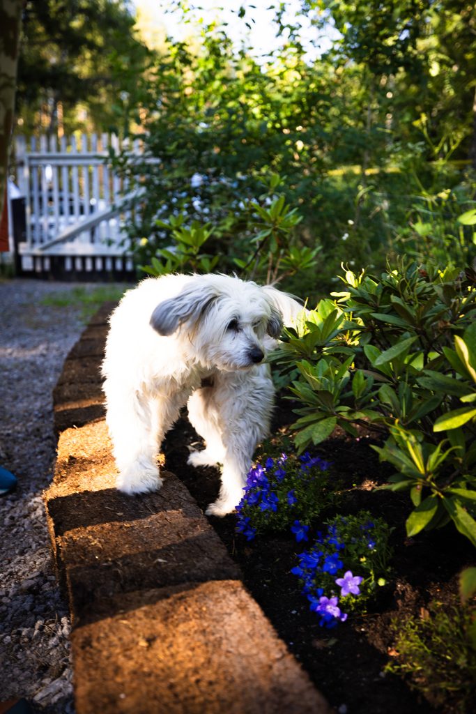 Sinikan ja Harryn koira nauttii puutarhan moninaisuudesta.