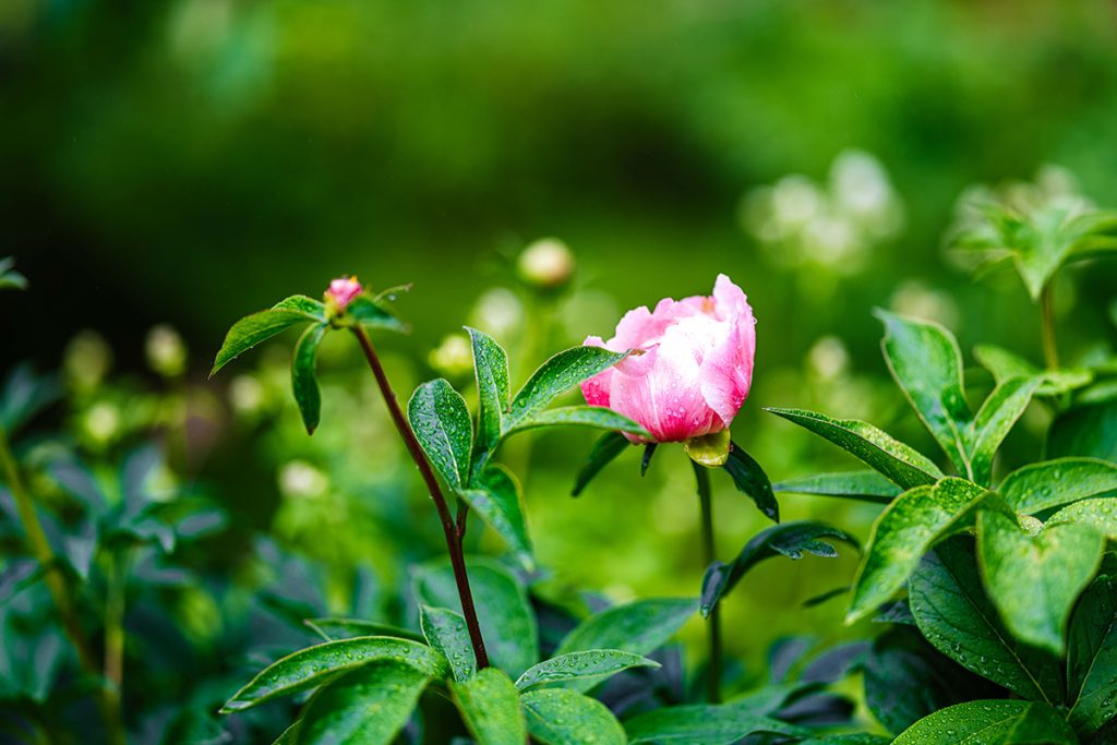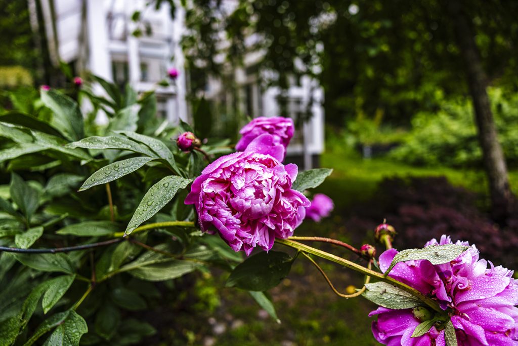 Puutarha on täynnä eri lajisia upeita pioneja.